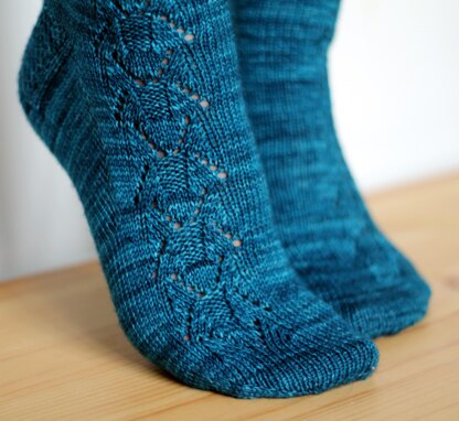 Tuil-Bheum, the rushing torrent of water caused by a sudden burst of rain, is captured in the flowing cascading lace down the side of these socks. Knit from the toe up with a gusset and heel flap, these socks are the perfect mix of relaxing knit and engaging pattern with a simple easy to learn lace pattern. With three widths and flexible length fitting, these are a great pattern for everyone.