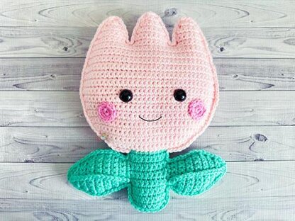 Our finished Tulip Flower Kawaii Cuddler® is 12″ x 10". Hook size, yarn choice, and crochet tension will affect each individual result.