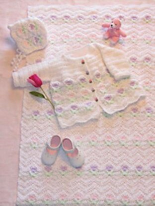 Using Bernat Baby Coordinates yarn with delicate sparkles, crochet this precious Blankie, Bonnet and Sacque.