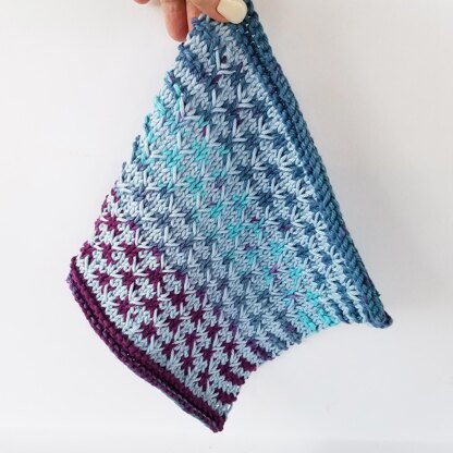 This 2-color cloth can be worked to produce either a lighter weight spa cloth using Dk weight yarn or heavier weight dishcloth using worsted 100% cotton. The contrast between the lighter color “Tulips” and the darker color “field” is created by alternating between the lighter and darker yarns, with just one active yarn being used per row (no stranding).
