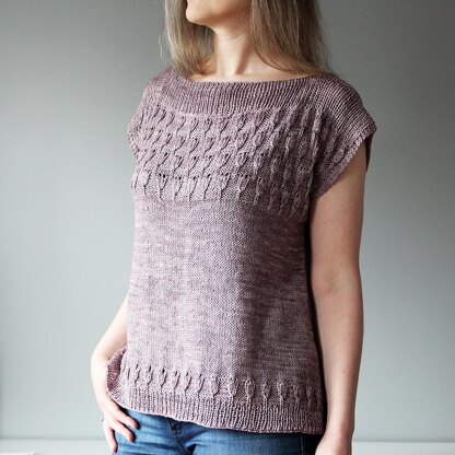 This beautiful summer top features a wonderful textured tulip motif (“Tulpe” means tulip in German) combined with ribbing and stockinette stitch to create a modern and feminine item for everyday wear.