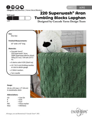 Tumbling Blocks Lapghan in Cascade Yarns 220 Superwash Aran - A392 - Downloadable PDF ist eine Kostenlos Anleitung zum Knitting von Cascade Yarns Design Team, die als Herunterladbares PDF in den folgenden Sprachen verfügbar ist: Englisch. Besonders geeignet ist sie für alle, deren Können bei Anfänger einzustufen ist. Probiere sie noch heute aus und kreiere dein nächstes Meisterwerk!