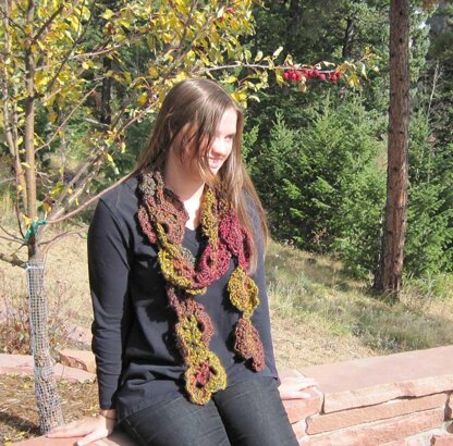 A flowing faux motif pattern worked in bulky yarn with graduated color changes stitches up quickly into this fun project. The scarf can also be worked shorter with a large button to create a neck cozy if desired.