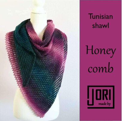 Do you have experience in the Tunisian simple stitch and would you like to learn another simple combinations in Tunisian crochet? Then this is a nice pattern for you. This pattern contains a detailed picture tutorial for each row to walk you through every step. I also added a chart. You need just a bit of experience in the Tunisian simple stitch. Other stitches will be explained. You need a tunisian crochet hook of 6 mm and a cable of 24”. I used 1 skein of Katia Stella. The size of the shawl is easy to adjust to your wish. The form of the shawl will be an elongated triangle.