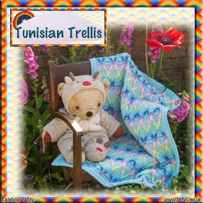 It is made in Tunisian Simple Stitch so is perfect for beginners. The rainbow trellis is made with chain loops which are laced up at the end. There are links in the pattern to videos to help with the lacing up and borders.