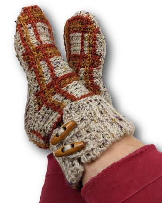Slip stitch crochet is ued to get a fun tartan style plaid look on the body of the slipper.