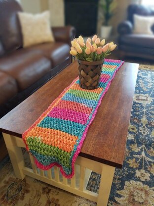 550 yards of worsted weight yarn. (at least 550) You may want a longer table runner. I used Mandala Ombre by Lion Brand and used 1.5 skeins for my length.