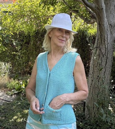 The Turquoise Summer Cardigan is a sleeveless buttoned cardigan, worked flat and bottom up. Back part and front parts are worked in one piece until the begin of the armholes. It has a v-Neck in front. The bands are knitted at the same time. Around the front edges and the neckline is a crochet row.