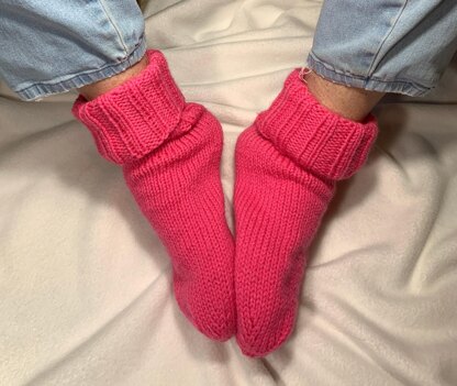 A silly name for a lounge slipper sock, but it gives you the idea of what a great fit this is on the feet! After the end of a hard day at work, just slip these on and relax. Your feet will thank you for these cuddly warm socks! This uses worsted weight yarn, and knitting needles US # 8, in double points. If you are lucky enough to have an 11 or 12 inch circular needle, they will knit up even faster! Working circular, keeps the momentum going ’round and ’round to make it a fast easy project! Make these for gifts for anytime of year, your friends and family will love you for it, and, they may ask for an extra pair!