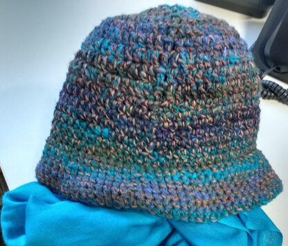 Simple to make, and simple in style, this versatile hat can be worn with the brim down as a 1920's cloche style or with the brim turned up. Blending three strands of yarn to produce stunning colour effects, it looks sophisticated but uses only the simplest stitches & techniques. Using variegated yarns every hat will be unique - and the only limit to the colour combinations is your imagination (or your wardrobe's colour theme)...