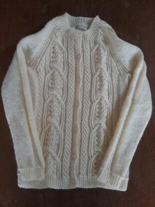 Girl's cardigan with lace and cable panels, age 10-11 years, 28-30" chest. Knitted in James Brett twinkle yarn, but other dk yarn could be used.