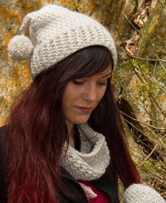 Patterns for a matching cowl, mittens and fingerless mittens are also available.