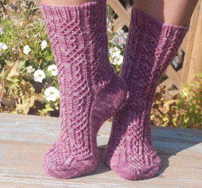 These intricate socks feature alternating panels of delicate twisted stitches and tiny cables. They are worked on larger than usual needles to avoid distortion of the pattern. These socks are worked from the top down in a fingering weight yarn. The pattern includes written instructions and charted stitch patterns.
