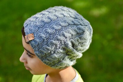 Twisted Trails is a unisex hat adorned by cabled ribbing. It is super stretchy and comfortably fits from toddler to large adult. Of course the fit will be slouchy on a smaller head and like a beanie on a larger head. The hat is knit from the bottom up and has a beautiful circular crown.