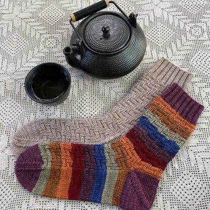 These socks are a fun way to add texture to self striping or tonal yarns! The patterning only requires knit and purl stitches, and since every second row is a repeat of the one before it makes for relaxed knitting.