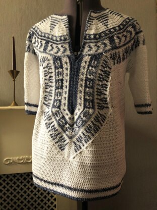 Size: One Size, with instructions on how to make larger Crochet Pattern, Two Colour Dashiki Style V Neck Shirt Skill Level: Advanced US Crochet Terms This crochet pattern is for a classic t-shirt, with a bold, Two Colour neck piece and finishing. The t-shirt is made in a yoke style, by completing the neck first and working in a circle until meeting to form the arms. The design features colour changing crochet design elements to create the decorative neck piece. You should be capable of changing colours before attempting this pattern as this is not described in the instructions. Shaping and pattern work are described in full and illustrated with pictures and charts There is a lot of stretch in the finished item, so the sizing is only approximate. The pattern includes one size neck piece with adjustments made in the body. I have listed this pattern as “advanced” because of shaping and pattern techniques.