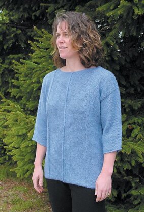 "Worked from cuff-to-center with three-quarter length sleeves, this wardrobe basic is knitted in two almost identical pieces," says Love. "Sweater is joined at center front and back, and two vertical Reverse Stocking stitch panels run from hem to shoulder each side of join, on the front and back. Sleeve is tapered with an increase panel from cuff to shoulder along top of sleeve, and increases on underside of sleeve. Cuffs and neck have optional crochet trim-– instructions included." This piece has the innate elegance of something that could have been worn over the last few centuries, and is a superb vehicle for all kinds of different yarns, from solids to novelties. (from Patternfish description)