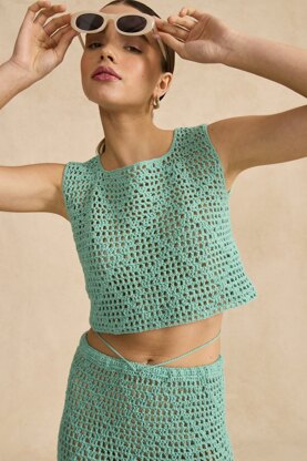 Crochet this statement two-piece in your favourite shade of Sirdar Stories. The close-fitting sleeveless crochet top has a delicate key-hole opening at the nape of the neck. The matching slinky maxi skirt has an elasticated waist and deep side split for movement. The lacy fabric, crocheted in a feminine diamond flower motif and trellis eyelet pattern, is ideal for keeping cool when the temperature rises.