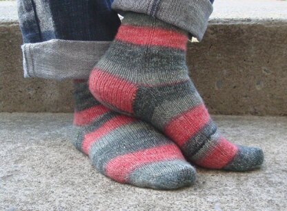 Several versions of this technique have been published in the past few years. This pattern provides two key improvements: there are multiple sizes, and I've engineered it so that the socks exactly match the result if you were to work in the normal manner.