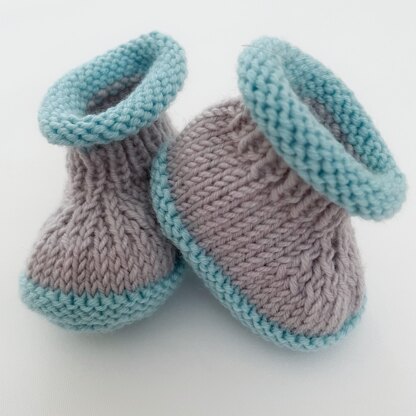 These cute little two-tone booties are quick and easy to knit. They are suitable for any beginner knitter, with instructions given both for knitting in the round and for knitting the booties flat and sewing up the back of the heel. Stitches used are knit and purl, as well as basic increases and decreases.