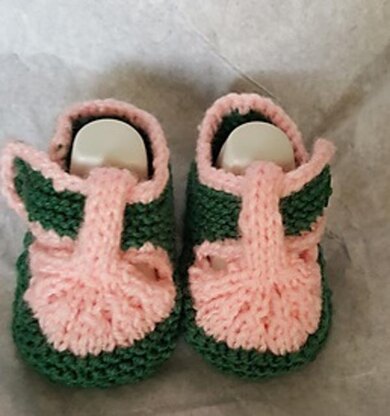 Garter stitch booties. Two Tone T bar. Different sizes achieved by varying ply and needle size. Knitted in the round using DPN.s the garter stitch is working in different directions, negating the need to purl rows.