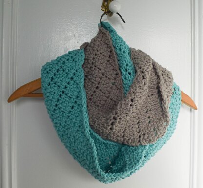 Traveling eyelets form a diamond pattern in this cozy, color blocked infinity scarf.