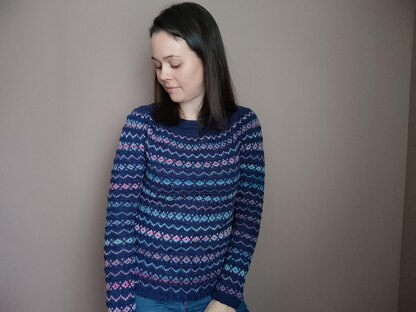 Tyllandsia is a top-down yoke sweater. It has a superb pattern combining stranded and textured stitch on the body and the sleeves. The stitch is very simple and accessible even to beginners.