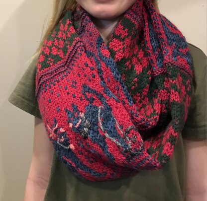 This pattern is knit using Sport and Dk weight yarns and written using the simple two color scheme with embroidery and finish work as an add on option. It is knit as a long tube and sewn together at the end to close off the ends making this a long cowl ideal fr wrapping and doubling up keeping your neck extra warm. Colorwork is chart only!