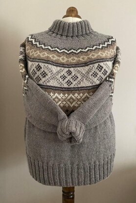 This sweater is worked in the round in a traditional Nordic top-down, one-piece method. It has a deep ribbed rollneck and cuffs. Sizes are given as chest sizes rather than UK clothing sizes. This is sized “to fit”, not to be oversized, so please size up if you prefer a looser fit.