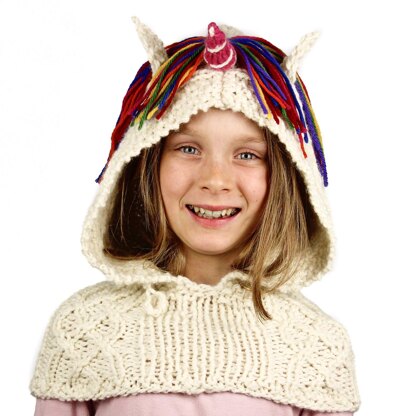 This listing is for a pdf knitting pattern for a unicorn hooded cowl. This snuggly hood knits up quickly in chunky yarn and can be worn with the hood up to keep your ears and head warm or with the hood down as a cosy cowl.