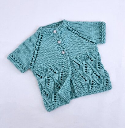 This is a lightweight summer baby cardigan pattern featuring short sleeves and delicate lace pattern on the body. The cardigan is a seamlessly knitted from the top down with raglan shaping, worked flat (back and forth) for the body, while the sleeves are knitted in the round.