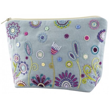 Color to brighten up this pretty embroidery pouches! This embroidery kit contains everything you need except the lining to complete this advanced beginner project. Fabric colour: blue. Pouch dimensions: 19x13cm.