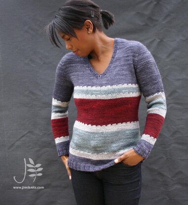 Under Duress: A 4-colour set-in sleeve V-neck pullover that is worked seamlessly from the top-down, with the sleeve caps integrally formed with the shoulders and neckline. The body and sleeves are worked in the round, adding blocks of colour and slip-stitch ‘jagged edge’ patterning.