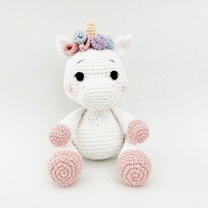 The unicorn measures approximately 18 cm in a seated position when using the materials mentioned above. Feel free to use any yarn you want, the toy itself won’t change, just the size.