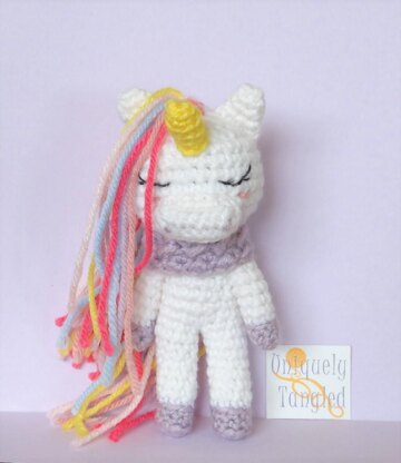 Materials:• Yarn: Any medium/worsted weight yarn of your choice of white, purple, yellow, and scraps of 12” • I used: Red Heart Super Saver (White, lavender, bright yellow, & various 12” scrap of yarn for mane and tail) • 2.75 hook (C) • Safety eyes (6mm) optional • Stitch marker • Small amount of black embroidered thread • Stuffing • Tapestry needle