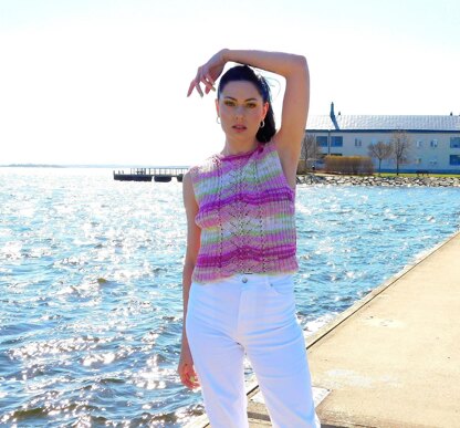 Construction: The top is worked bottom up, in the round. It is fitted to the body thanks to the ribbing and has a flattering decorative central lace panel. The neck and sleeves are highlighted in garter stitch.