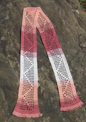 This is a scarf made using filet crochet and a simple chart. New to reading charts? This is a great project for beginners to learn filet and practice reading a chart. The fringe is also crocheted right onto the scarf