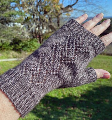 These mirrored fingerless mittens contain an easy repeating motif up the back of each hand, as well as a specialized cuff that fits comfortably at your wrist. This pattern was especially created to use one 50 g skein of luxurious Sport-weight 50/50 Yak/Silk yarn dyed and sold by Good Fibrations in Saint John, NB, Canada.