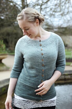 A delicate and light cardigan with leaf details in the yoke and sleeves. The cardigan is inspired by misty spring mornings when the morning dew still lingers on spring’s first leaves.