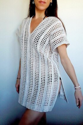 Very easy basic pattern for such a cute caftan! It is crocheted sideways in one long piece and then the side seams need to be sewed together. The caftan is meant to fit loose and it has a v-neck in the front & in the back. I recommend using a light cotton yarn so it's not heavy. It fits all adult sizes & there are 4 lengths to choose from: 27", 29", 31" and 33". Since there are so many variations of different widths & lengths I cannot estimate the total number of yards needed for all. Size XS/S and length 29” is shown in the picture which required 945 yards of yarn. The pattern uses basic American crochet terminology and if you have experience with reading a written pattern this is a great pattern for a beginner.