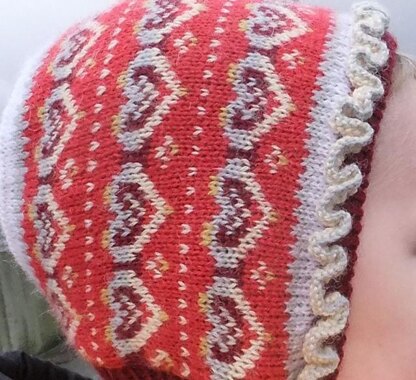 Designed for a workshop so that the colourwork part was done during the class and the easier parts (frill and neckband) could be done afterwards.