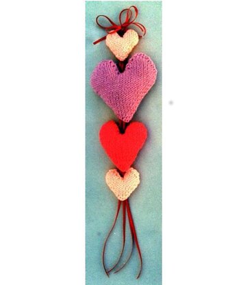 Lovely to hang on your front door for Valentines Day! Or hang anywhere in your home. This beautiful to keep on the bedroom wall all year round too. Very easy hearts to knit. Then you stuff hearts and with easy directions, sew to a ribbon background. You can also knit up the hearts for individual small pillows, toys, or place a few in a basket for decorating! Uses worsted weight yarns, knitting needles, US # 9. Finished length of this hanging is about 16 long.