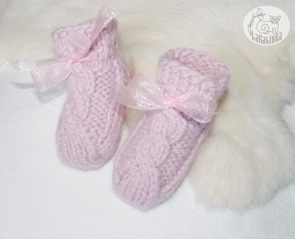 Design details: ● seamless, worked in one piece ● worked from cuff in the round ● with cable pattern ● Kitchener st for grafting the last sts on the Toe ● with organza ribbon around the ankle