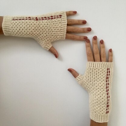 The Vanilla Cream Mitts are oh, so elegant! Those delicate ribbons….what a simple way to add colour (and a touch of glamour) to your knitting.