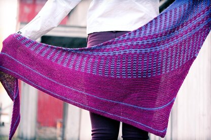 An asymmetric shawl that combines various patterns, this bias wrap moves from simple garter stripes through slipstitch colorwork and back again. Cast on at the long, narrow end, Vary grows on the bias, only ever using one color at a time in each row. Choose two colors or even more, and make it your own by varying the placement of the different stitch patterns; the simple construction adapts easily to different amounts of yardage and to your artistic vision.