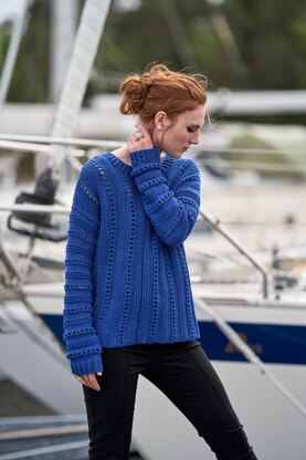 Sideways pullover in an eyelet pattern with a center join to enable it to hang straight like a sail or Vela - Italian for sail. Oversized body with narrow sleeves to minimize the volume. Vela ends in a round neck with ribbing. Dress it up with a cowl, that can be worn once or twice around your neck. Perfect for summer, knitted in a lovely cotton mix yarn called Hempathy from Elsebeth Lavold with a crisp stitch definition.