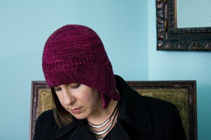 Velma is a close-fitting cloche-style hat with an asymmetrical brim that can be worn either up or down. The brim of the hat is knitted flat. Then, stitches are picked up along the top edge and joined for working in the round. The twisted rib of the band (flanked by lateral braids) is an homage to the grosgrain ribbon bands that frequently adorned the hats of the era. *Note: Blocking is not recommended for the finished hat, as it may cause the flaps to lose the rigidity that helps them hold an "upright" position.*The Velma pattern was originally created for the February 2014 installment of the Woolen Rabbit Yarn Club.