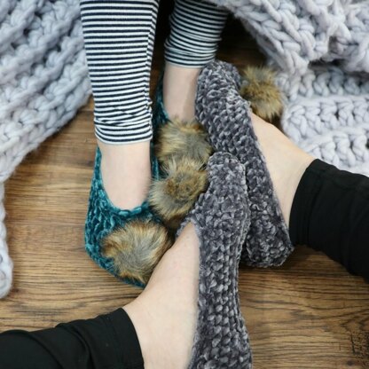 PDF digital download crochet pattern for Cozy Soft Ballet style pom pom slippers made in Bernat Velvet. Pattern includes Children Sizes 9/10 (11/12, 13/1, 2/3, 4/5) Adult Sizes 4/5 (6/7, 8/9, 10/11, 12/13). These are a quick and easy pattern great for holiday gifts and markets. Pattern includes easy faux fur pom pom tutorial and full video for child size 2/3.