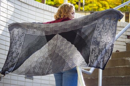 The beauty of a gently curving stitch pattern combine with strong diagonal, vertical and horizontal lines, for a rectangular wrap based on a triangular shawl. The color changes of the gradient yarns are manipulated to illustrate the unusual shaping while still being allowed to naturally flow from one shade to the next.
