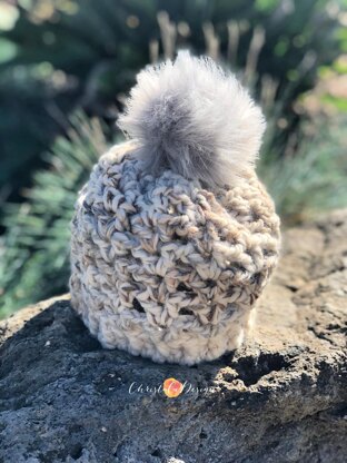 This hat is worked bottom up and looks great finished off with a pom pom.